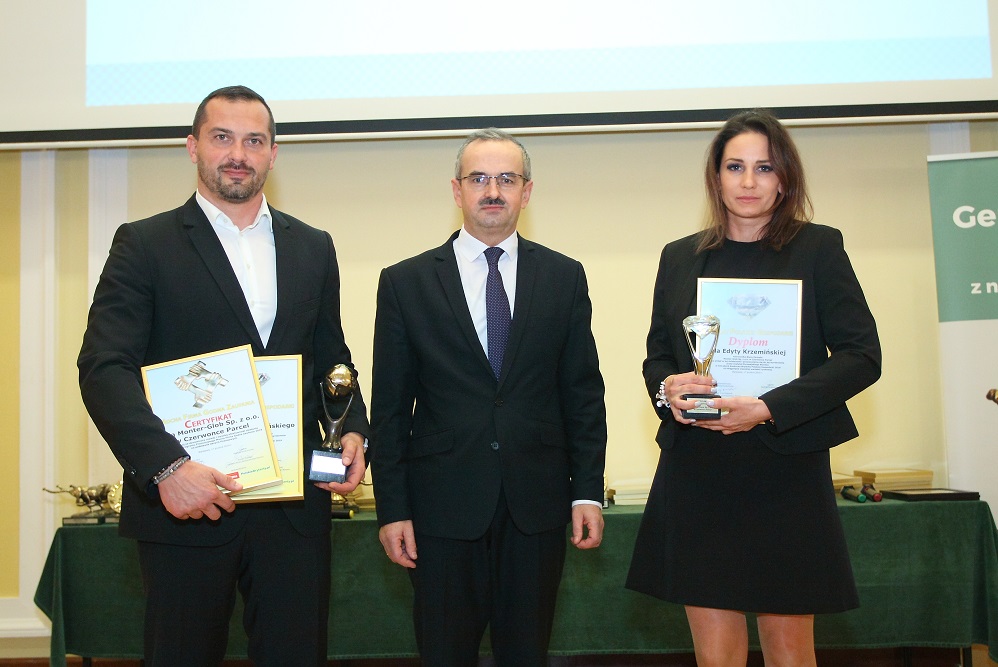 Prezes Zarządu Roland Krzemiński (z lewej) i Kierownika Biura Zarządu Edyta Krzemińska odebrali dyplomy i statuetki dla Monter-Glob Sp. z o.o. na VIII Kongresie Nowoczesnej Gospodarki w Warszawie 17 grudnia 2019 roku