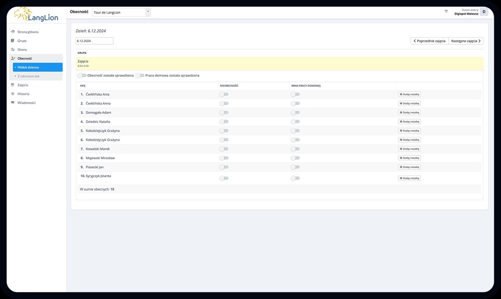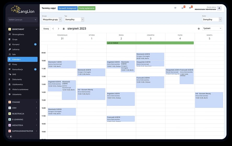 LangLion integruje w jednym miejscu wszystkie kluczowe obszary działalności szkoły: od zarządzania zajęciami, kursantami i lektorami, po finanse, umowy i raporty.