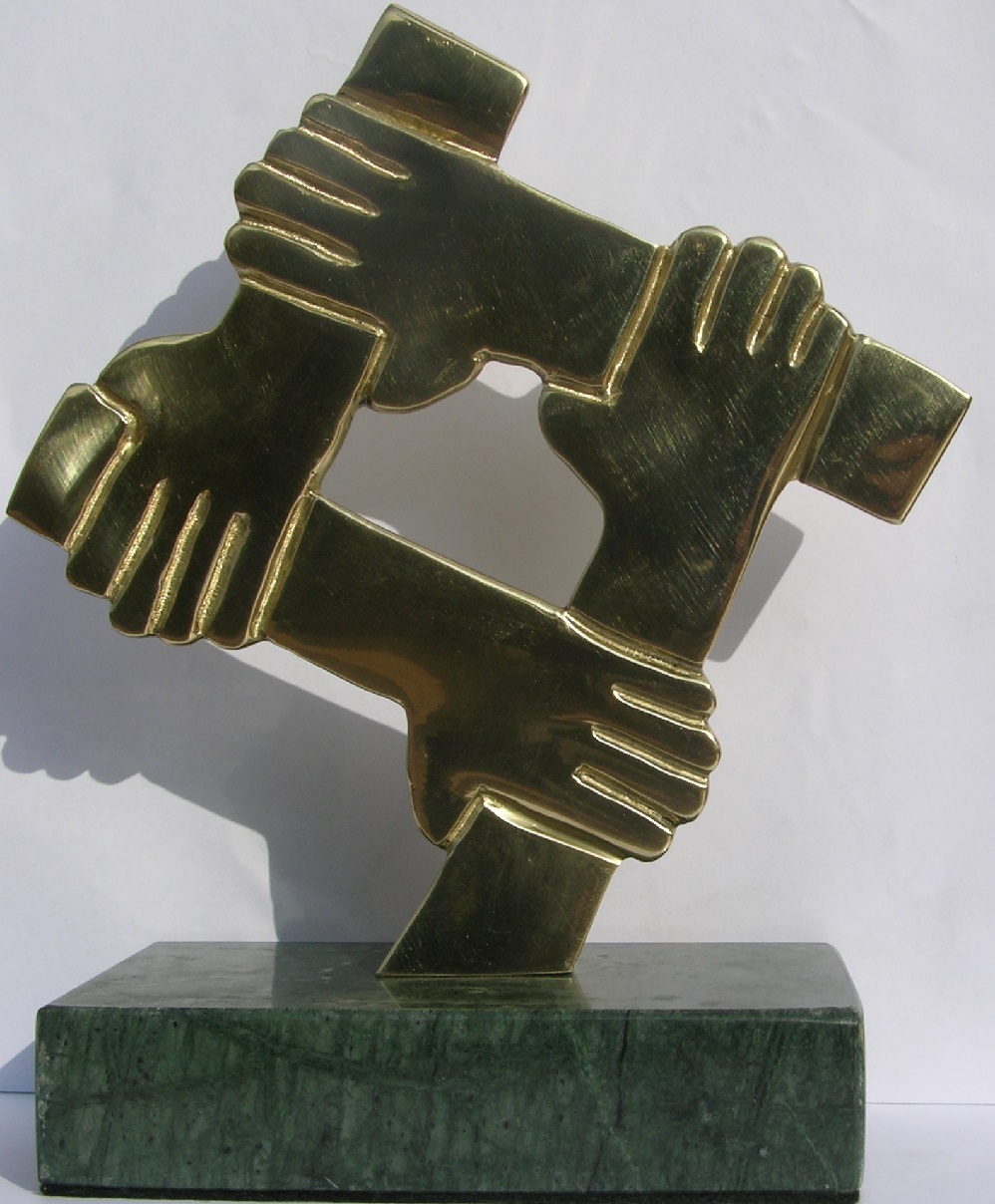 Statuetka Programu Promocyjnego Mocna Firma Godna Zaufania  2018. Jej głównym elementem są złączone ręce pracowników i partnerów biznesowych, tworzące mocne ogniwo gospodarki. Ręce wykonane są z mocnego metalu.