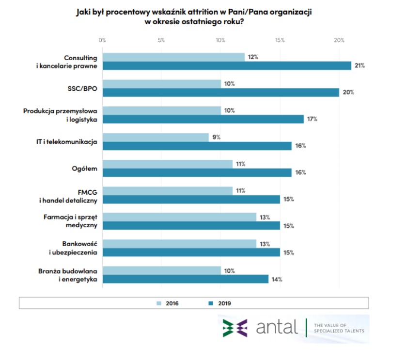 Potwierdza się to w innych badaniach, opracowanych przez specjalistów zajmujących się zawodowo rekrutacją i doradztwem personalnym. Według najnowszego raportu Antal, Asseco Business Solutions i Grupy Nowy Styl z września br., wskaźnik dobrowolnej rotacji pracowników (attrition), średni dla całego rynku, wzrósł od 2016 r. z 11% do 16%. Widać to zwłaszcza w branży SSC/BPO (centra usług wspólnych – obsługa klienta, księgowość, zakupy), gdzie zanotowano wzrost o 10 p.p. do 20% oraz consultingu i kancelariach prawnych – wzrost o 9 p.p. do 21%. Pozostałe branże, którym szczególnie doskwierają odchodzący pracownicy, to produkcja przemysłowa, logistyka, IT i telekomunikacja.